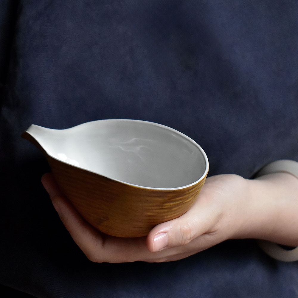 這款公道杯採用傳統粉引工藝燒製,質感粗獷而不失溫潤,呈現出手工陶器獨有的自然美感。外壁肌理感豐富,如同大地的原始肌膚,與內壁光滑細膩的白釉形成鮮明對比,展現出粗獷與精緻並存的和諧之美。